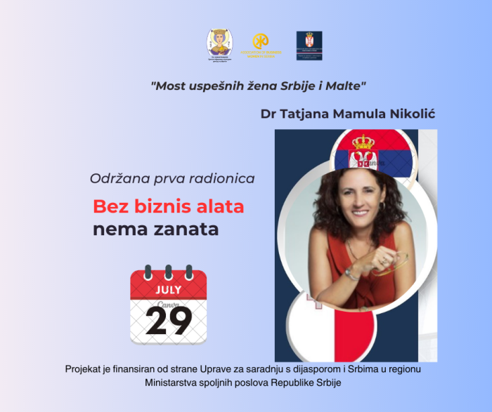U novoj sredini, na Malti, obrela sam se 2017. godine i sledeći ustanovljene principe poslovne etike i humanosti započela svoj privatni posao, a sa prijateljima i istomišljenicima osnovala nevladino udruženje Srpski obrazovno kulturni centar Sveta Jelena Anžujska, čiji sam generalni sekretar. SOKC je prošle godine dobio sredstva od Uprave za dijasporu i otvorio prvu školu srpskog jezika na Malti. Verujem da će se moje angažovanje u Srpskom obrazovno kulturnom centru, kao i Udruženju poslovnih žena Srbije, međusobno dopunjavati i zauzeti svoje mesto u aktivnom procesu povezivanja sa maticom i otvaranju mogućnosti koje nude umrežavanje i edukacija.