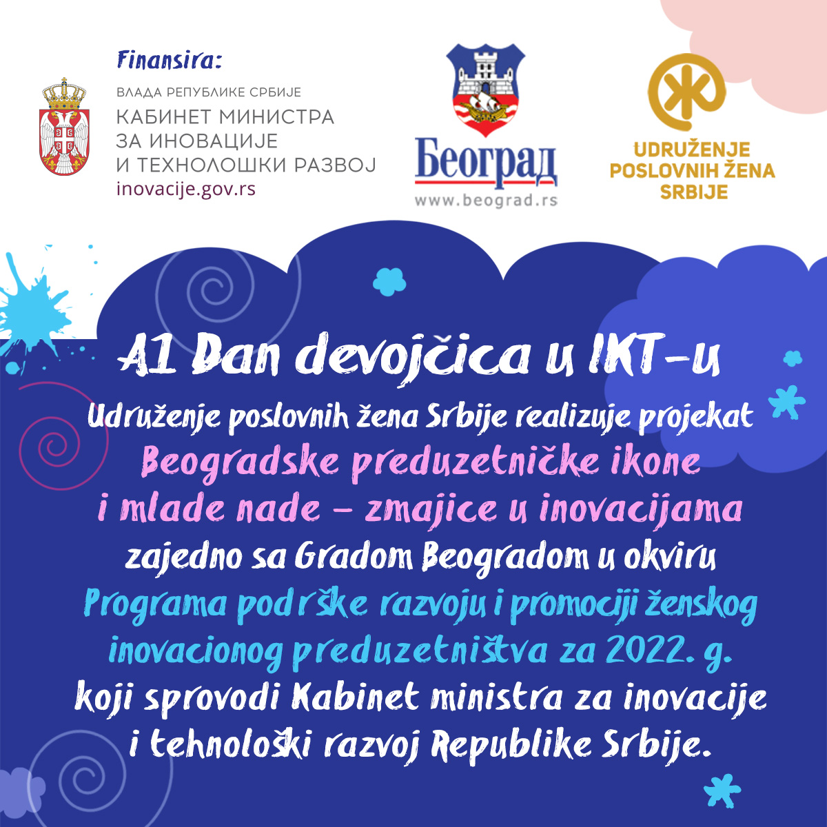 - Ove godine Dan devojčica u IKT sektoru organizovan je u saradnji sa Gradom Beogradom kroz projekat „Beogradske preduzetničke ikone i mlade nade – zmajice u inovacijama“ koji je podržan od strane Kabineta ministra za inovacije i tehnološki razvoj, u okviru Programa podrške razvoju i promociji ženskog inovacionog preduzetnišva za 2022. godinu Vlade Republike Srbije