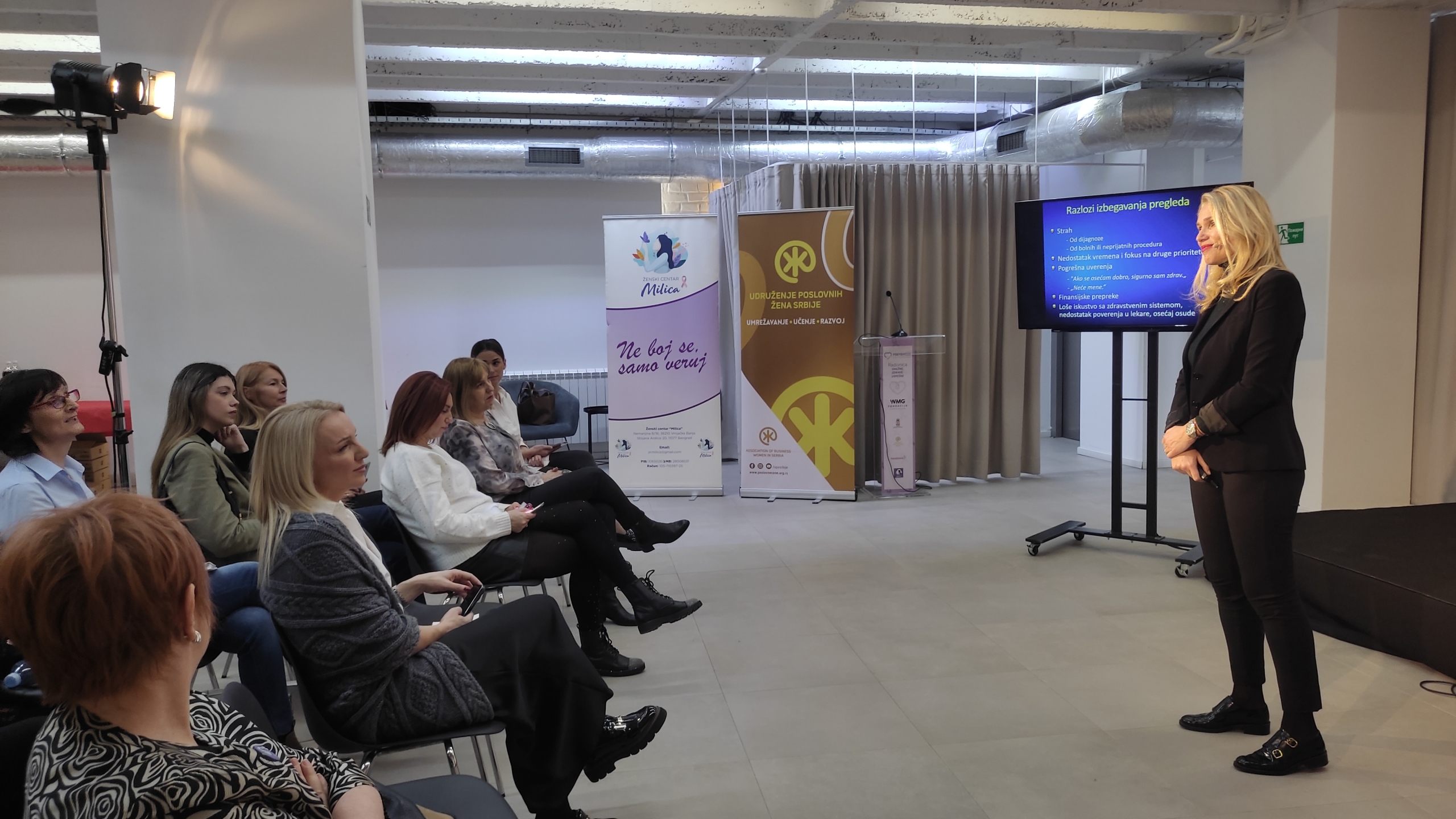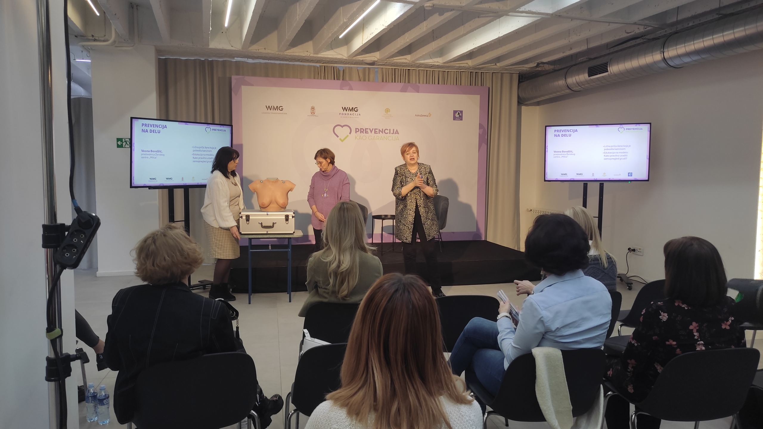 Pored Irene Petrović, direktorke WMG fondacije radionicu, kojoj su prisustvovale i članice UPŽ Srbije, otvorila je dr Sanja Popović Pantić, predsednica Udruženja poslovnih žena Srbije, naglasivši značaj podizanja svesti o prevenciji kod žena. Prisutni su imali priliku da čuju više o dijagnostici od prof. dr Dragane Đilas, načinu prevazilaženja teških momenata kroz psihološko savetovanje i podršku od dr sc. med. Marije Andrijić, a u trećem delu radionice članice Ženskog centra „Milica“, na čelu sa predsednicom Vesnom Bondžić, koje su i same uspešno prošle proces lečenja, govorile su o tom procesu i predstavile postupak samopregleda.